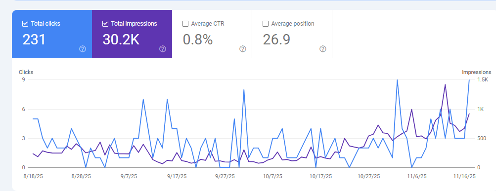 • 286% increase in website traffic. The website’s traffic jumped from 30–35 monthly visits to 118 monthly visits, as shown in the Google Search Console data.